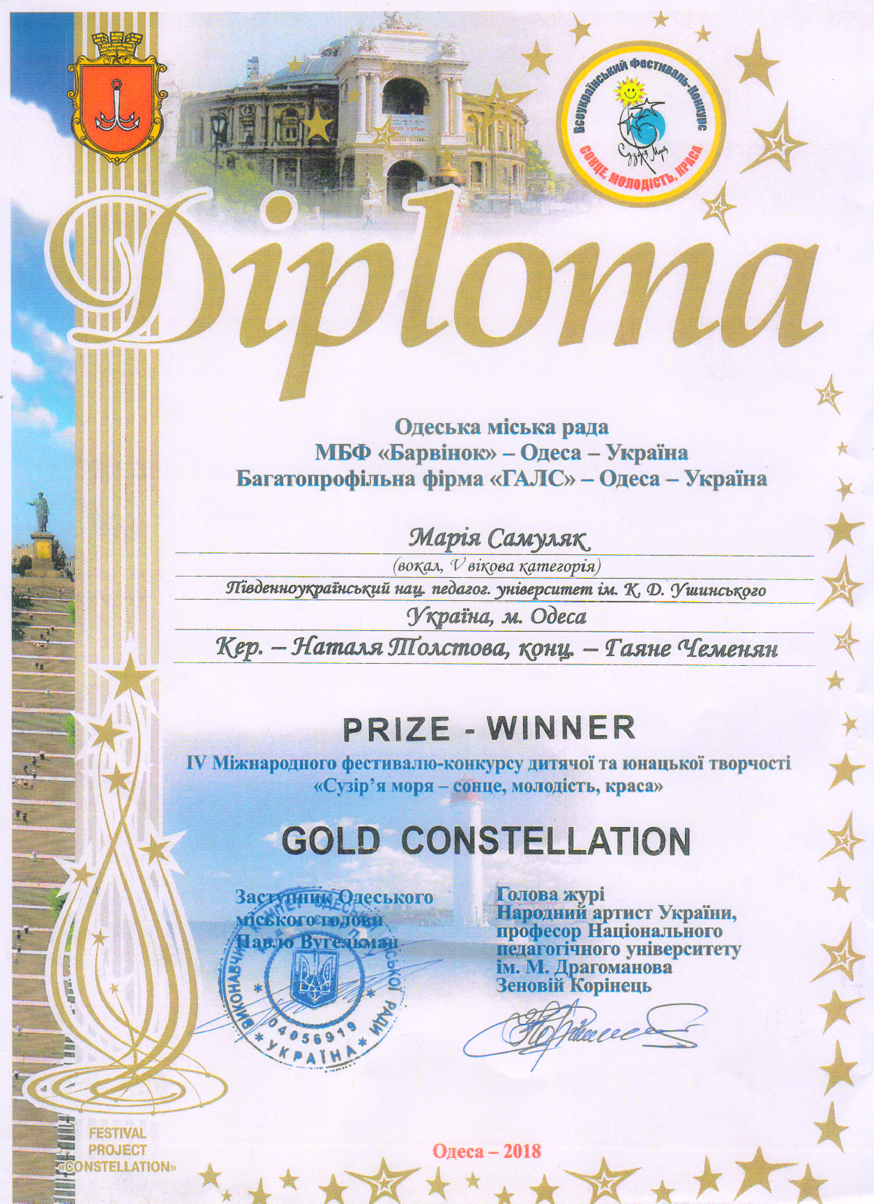 15-18 червня 2018 року в Одесі пройшов IV Міжнародний фестиваль-конкурс дитячої та юнацької творчості «Сузір’я моря - сонце, молодість, краса», який проходив під патронатом Міністерства освіти та науки України, Національного всеукраїнського музичного союзу, Національної академії мистецтв України та мерії міста. Це масштабний проект об’єднує молоді таланти в різних номінаціях. В номінації «Академічний спів» І премію одержала магістрантка факультету музичної та хореографічної освіти Марія Самуляк (клас викладача Толстової Н. М., концертмейстер Чеменян Г. П.) Голова журі народний артист України Зеновій Коринець привітав Марію з перемогою та відзначив високий рівень її виконавської майстерності.