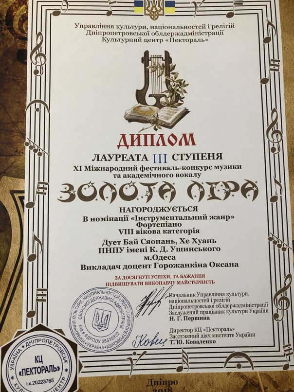 В номінації «Ансамблеве виконавство» лауреатами ІІІ ступеню стали магістранти Хе Хуань та Бай Сяонань (клас доц. Горожанкіної О.Ю.).