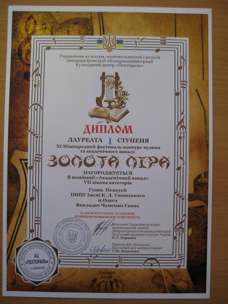 В номінації «Академічний вокал» звання лауреата І ступеню одержав Гуань Пенхуей (клас викл. Чеменян Г.П., концертмейстер Турбинський А.Ю.).