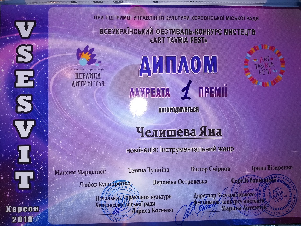 11-12 травня в Херсоні пройшов Всеукраїнський фестиваль-конкурс мистецтв «ART TAVRIA FEST» на якому І премію посіла магістрантка факультету музичної та хореографічної освіти Яна Челишева (клас викл. Кабур Л.М.).