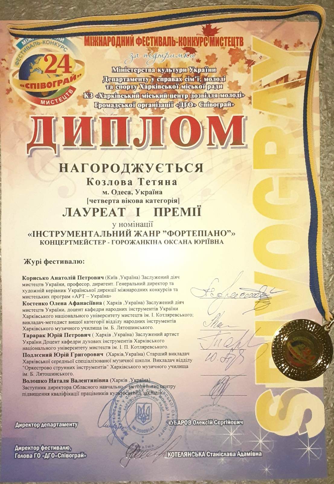18 – 19 жовтня 2019 року за підтримки Міністерства культури України в місті Харків пройшов Міжнародний конкурс-фестиваль мистецтв «Співограй». Виступ учасників інструментальної номінації відбувся в Харківському музичному училище імені Б. Лятошинського і включав виконання двох різнохарактерних творів. Журі відзначило високий рівень професійної підготовки студенток 4 курсу факультету музичної та хореографічної освіти: перемогу та звання лауреату І ступеню одержала Тетяна Козлова (клас доцента Горожанкіної О.Ю.), ІІІ премію посіла Лі Хунянь (клас викладача Мамикіної А.І.).
