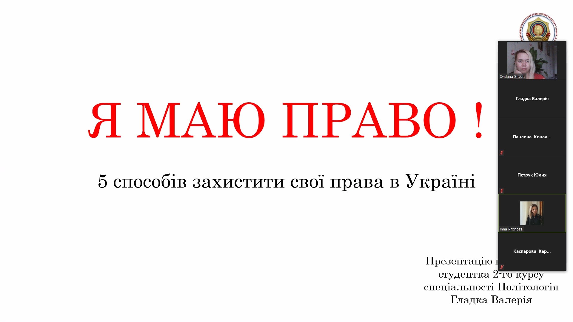 Традиційно 10 грудня в усьому світі відзначається День прав людини. Викладачі кафедри політичних наук і права, студенти спеціальностей 081 Право та 052 Політологія Південноукраїнського національного педагогічного університету імені К. Д. Ушинського вже не в перший раз долучаються до цього свята. Цього року кафедрою був організований круглий стіл "Я маю право!", на якому студенти представили презентації з питань захисту прав людини в Україні та світі.