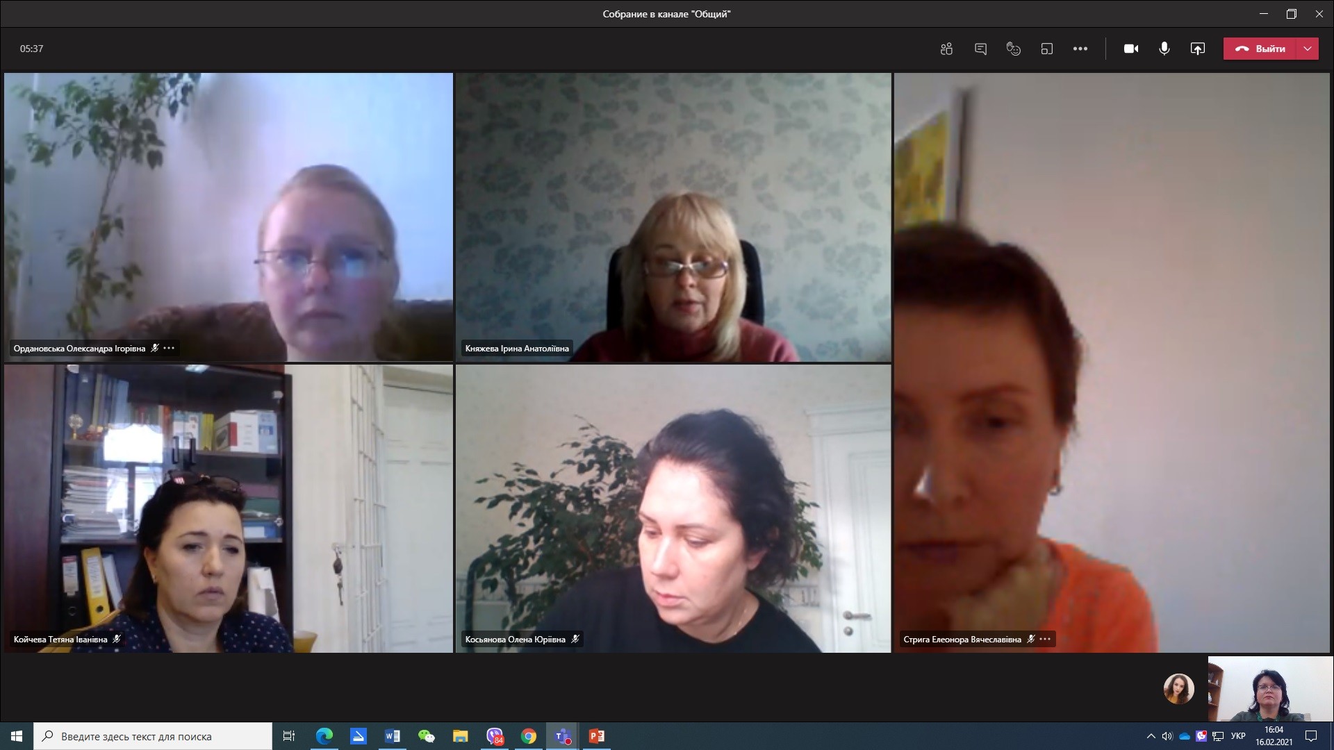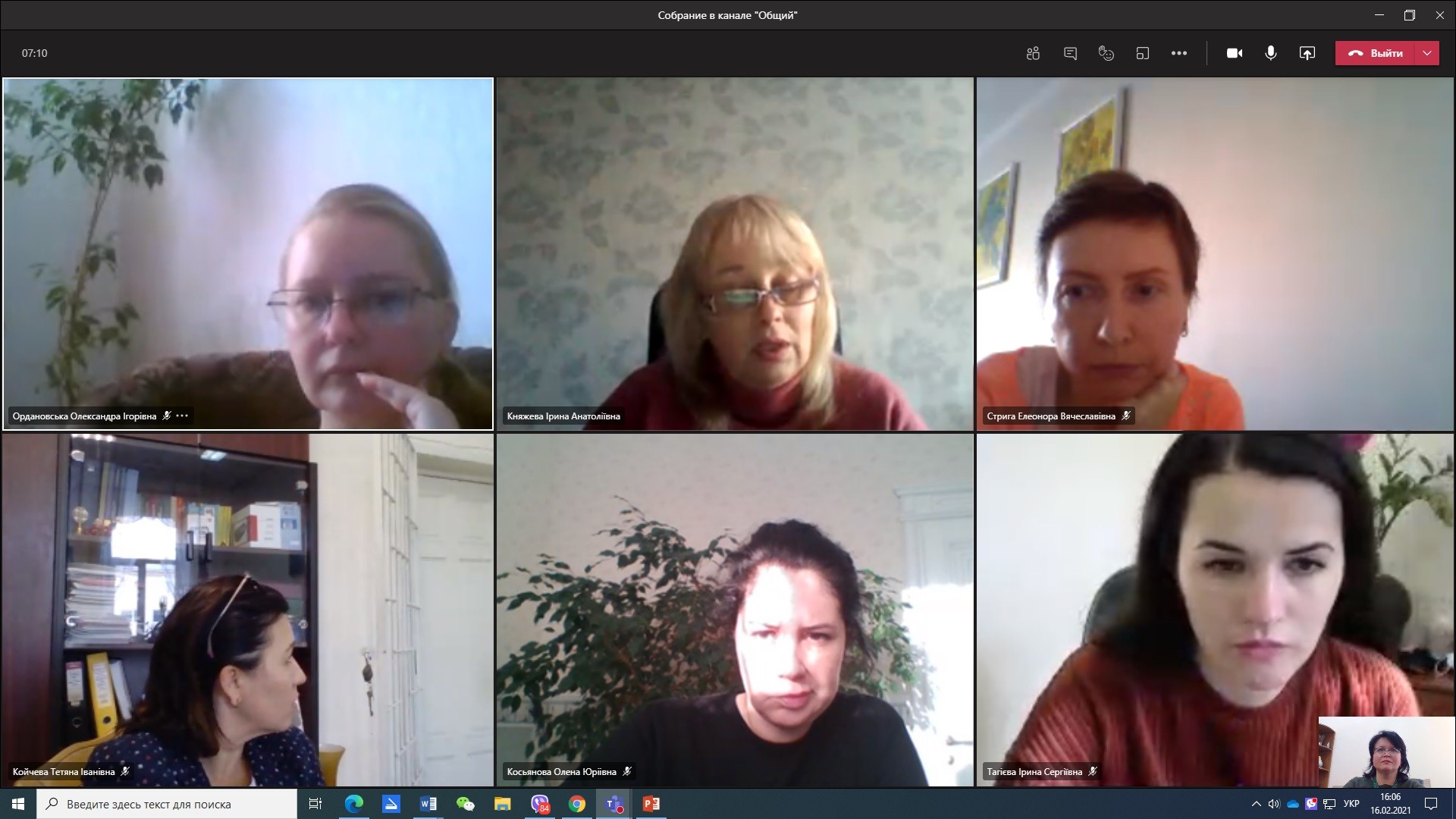 Університетська група у складі д. пед н., проф. Княжевої І. А., д. пед н., проф. Койчевої Т. І., д. пед н., проф. Ордановської О. І., д. політ. н., проф. Музиченко Г. В., к. псих. н., доцент Косьянової О. Ю., к. псих. н., доц. Пивоварчик І. М., к. пед. н., доцент Стриги Е. В., викладач Тагієвої І. С. обговорила напрацювання вітчизняних фахівців, власні університетські наробки та досвід, здобутий співробітниками університету в попередніх міжнародних проєктах, а також наявні рекомендації європейських колег та міжнародних організацій з питань визначення кола трансверсальних компетентностей, їх значущості при формуванні сучасних конкурентоздатних кадрів для сфери освіти.