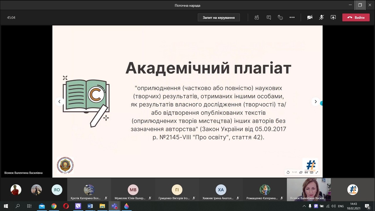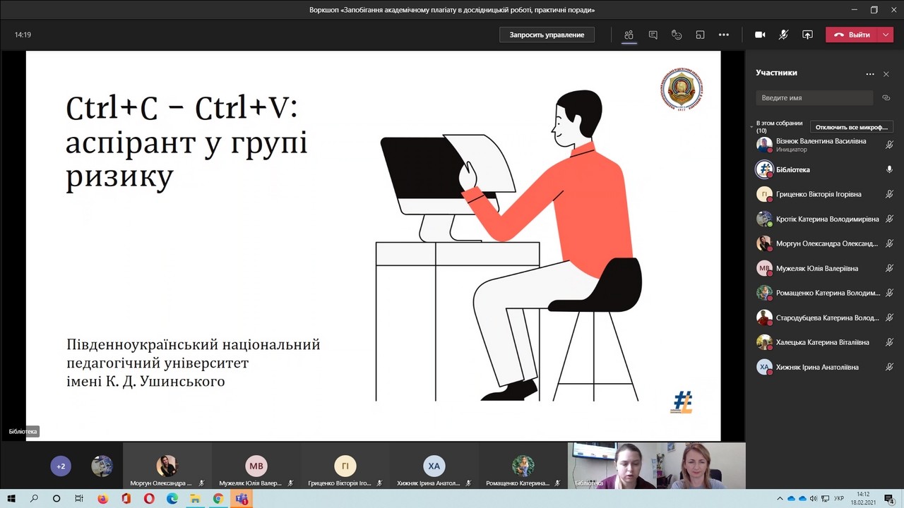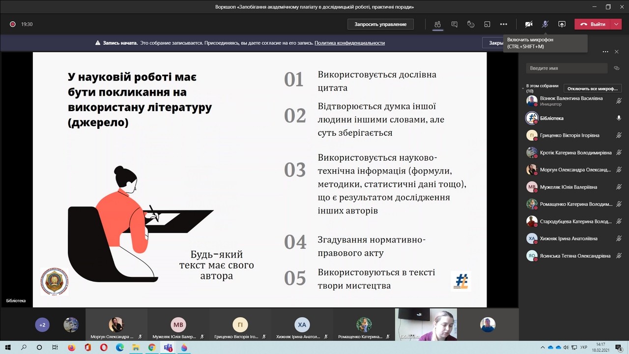 Під час воркшопу «Запобігання академічного плагіату в дослідницькій роботі, практичні поради», який провели директорка бібліотеки Валентина Візнюк та заступниця директорки Олена Спасскова, здобувачи третього (освітньо-наукового) рівня вищої освіти дізналися про особливості технічної перевірки письмових робіт на ознаки плагіату програмою Strikeplagiarism, ідентифікацію плагіату і самоплагіату, особливості покликання тощо.