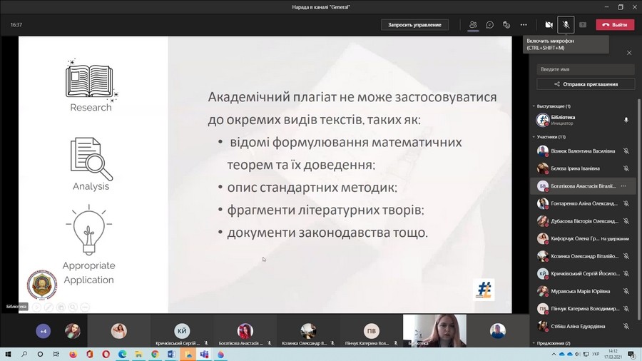17 березня 2021 року бібліотека Державного закладу «Південноукраїнський національний педагогічний університет імені К. Д. Ушинського» провела онлайн-воркшоп для магістрантів з теми «Cntr-C + Cntr-V – магістрант у групі ризику».