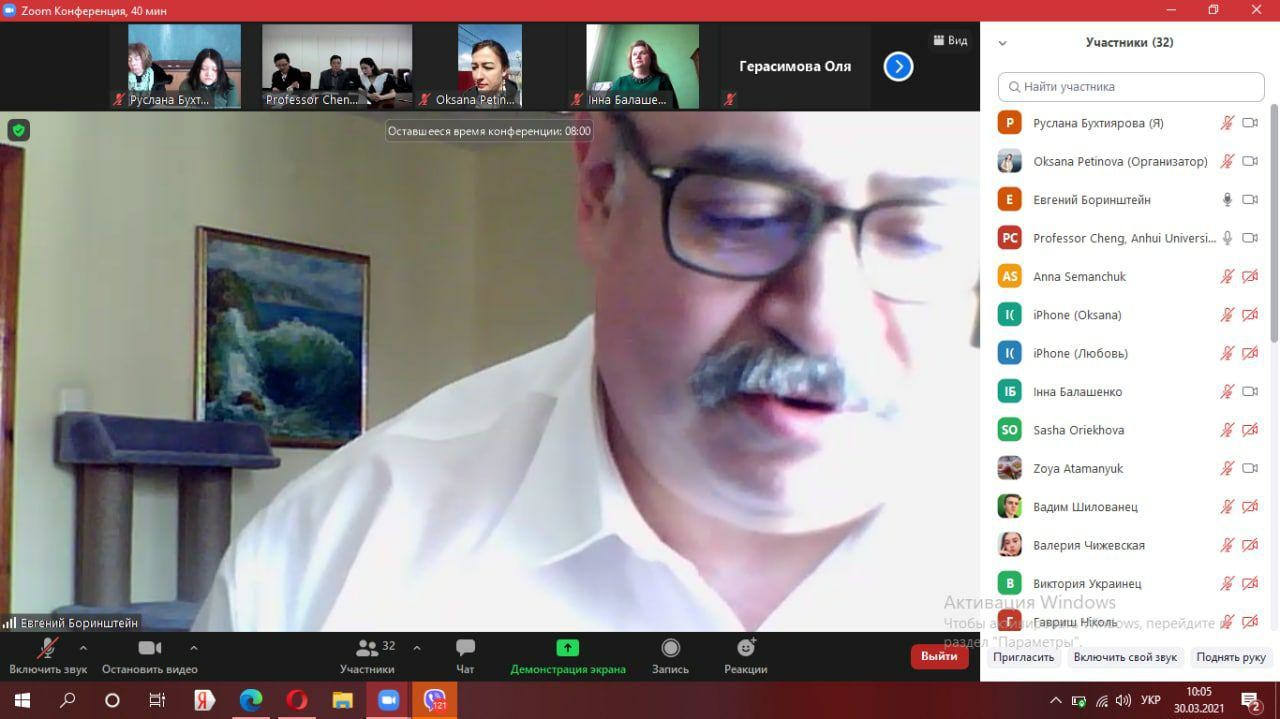 Зі сторони Університету Ушинського виступив із доповіддю завідувач кафедри філософії, соціології та менеджменту соціокультурної діяльності д. філос. н., проф. Борінштейн Є. Р. та координатор проєкту, гарант ОНП за спеціальністю 033 «Філософія» д. філос. н., проф. Петінова О. Б. Були обговорені питання академічної мобільності, науково-педагогічного стажування викладачів та аспірантів, інші форми взаємодії, й визначені першочергові пріоритетні напрями поальшої співпраці. Своїми враженнями від навчання в нашому університеті поділилась студентка із Китаю спеціальності 033 «Філософія» Дин Юйцзин, яка неодноразово брала участь в різних формах роботи під керівництвом канд. філос. н., доц. Виноградової Н. М.