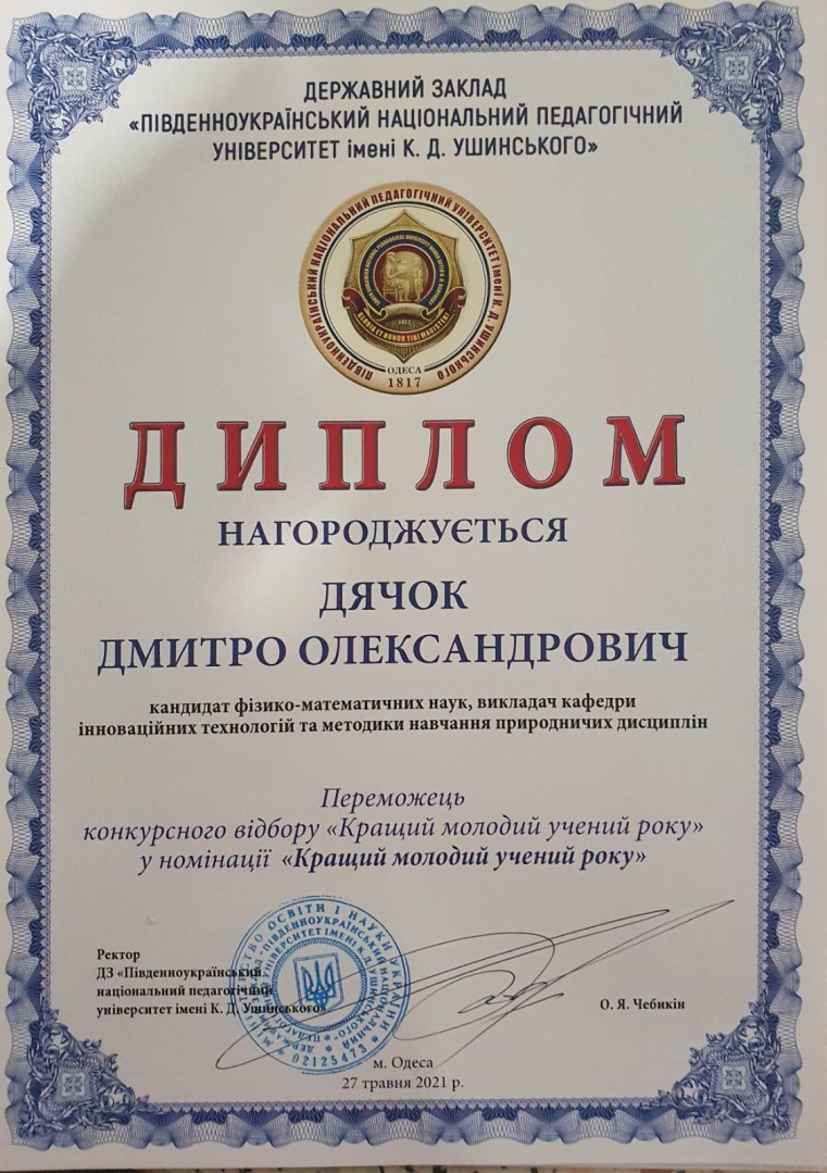 У травні 2021 року викладач кафедри інноваційних технологій та методики викладання природничих дисциплін Університету Ушинського, кандидат фізико-математичних наук Дячок Дмитро Олександрович отримав диплом третього ступеня як лауреат Премії Одеської області організації профспілки працівників освіти і науки України. Водночас Дмитро Олександрович став переможцем конкурсного відбору Південноукраїнського національного педагогічного універистету імені К. Д. Ушинського в номінації «Кращий молодий учений року» за результатами наукової роботи в 2020/2021 навчальному році.