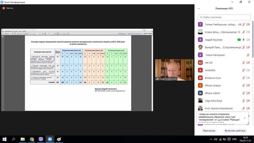 01 листопада 2021 року, у межах співпраці між Університетом Ушинського та Одеським регіональним інститутом державного управління, викладачі кафедри освітнього менеджменту та публічного управління взяли участь в експертній нараді «Шляхи реалізації на рівні територіальних громад Національної стратегії сприяння розвитку громадянського суспільства в Україні на 2021-2026 роки».