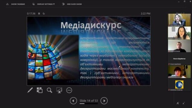 4 листопада 2021 року в Університеті Ушинського для здобувачів ОНП «Філологія» в межах професійної дисципліни «Новітні напрями в мовознавстві ХХ-ХХІ ст.» відбулась гостьова лекція Олександри Романюк, доцента кафедри англійської мови НУ «Одеська морська академія», на тему «Медіадискурс: когнітивно-прагматичний аспект». Олександра Романюк має 8 публікацій у міжнародній наукометричній базі даних Scopus з цієї тематики. Здобувачі ознайомилися з класифікацією медіадискурсу відповідно до медіаканалу реалізації та методологічними засадами дослідження.