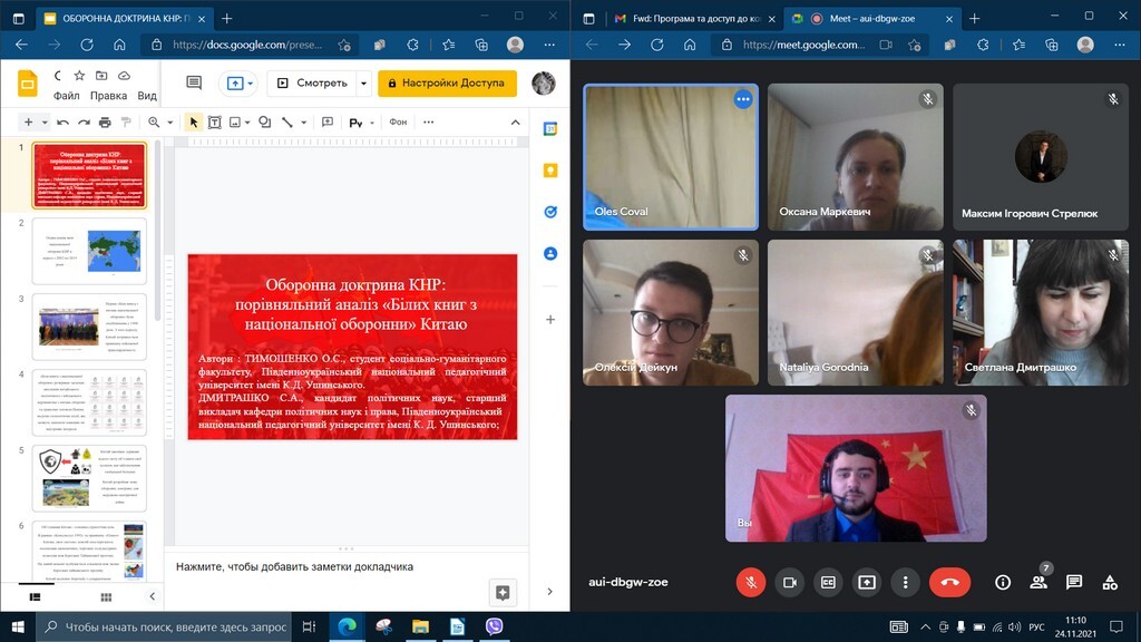 24 листопада 2021 р. відбулась XV Міжнародна наукова конференція «Китайська цивілізація: традиції та сучасність» під патронатом Інституту Сходознавства ім. А. Ю. Кримського. У засіданні секції «Китай в сучасному світі: міжнародно-політичний аспект» взяли участь к. політ. н., старший викладач кафедри політичних наук і права С. А. Дмитрашко та студент 4 курсу спеціальності «Політологія» Олександр Тимошенко. Олександр Тимошенко представив доповідь та презентацію «Оборонна доктрина КНР: порівняльний аналіз «Білих книг з національної оборони» Китаю, в якій було проаналізовано найважливіші тенденції та динаміка змін в оборонній доктрині з 2002 року по 2019 рік. Доповідь викликала велику зацікавленість науковців. Також науковці обговорювали економічну стратегію «подвійної циркуляції» Китаю (Олег Коваль); стосунки Китаю з іншими країнами в АСЕАН (Наталя Городня); образ Китаю в інформаційному полі на прикладі матеріалів редакцій BBC та інші важливі теми. У висновках конференції підкреслено важливість дослідження розвитку Китаю в сучасному світі.