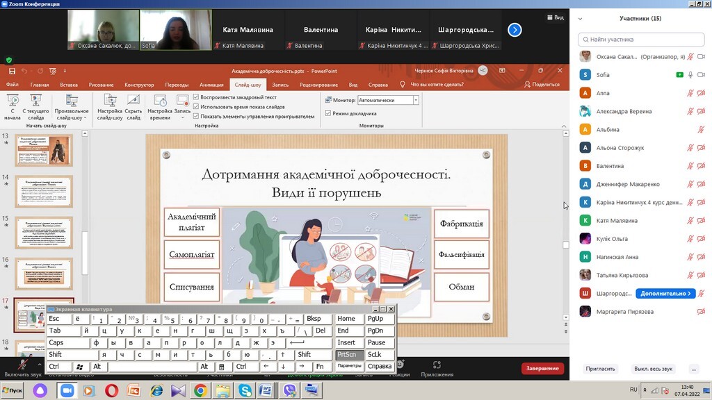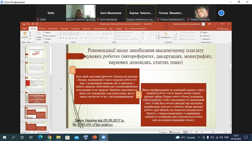 До обговорення актуальних питань академічної культури й етики у вищій освіті, академічної доброчесності в сучасному освітньо-науковому просторі, політики запобігання плагіату долучилися студенти спеціальності 281 «Публічне управління та адміністрування», магістри спеціальності 073 «Менеджмент». В обговоренні взяли участь також здобувачі освіти спеціальностей 014 Середня освіта (Трудове навчання та технології), 014 Середня освіта (Образотворче мистецтво), 015 Професійна освіта (Дизайн), 023 Образотворче мистецтво, декоративне мистецтво, реставрація художньо-графічного факультету Університету Ушинського.