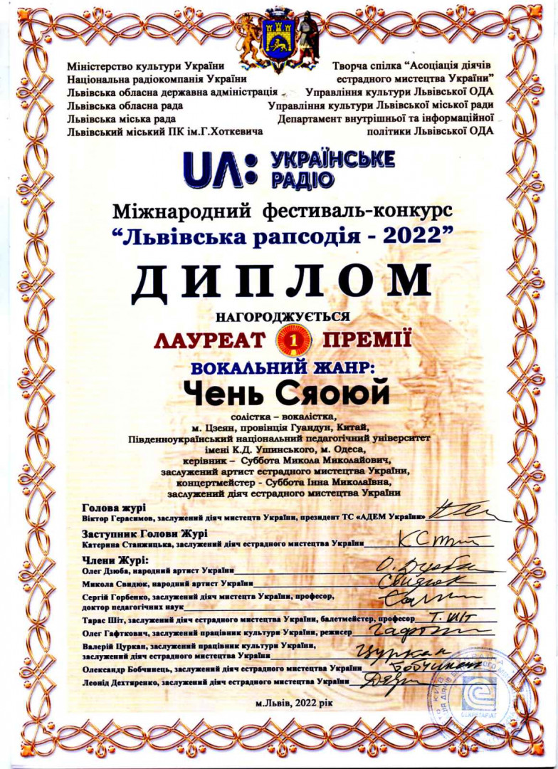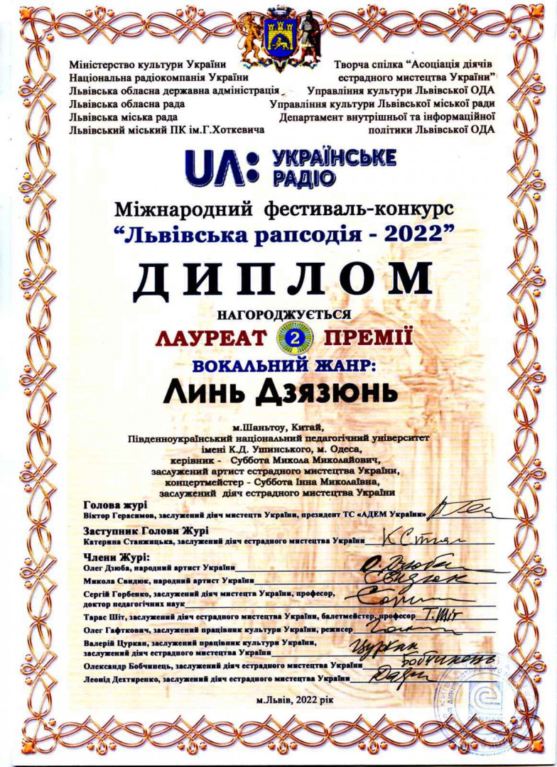 Високі оцінки журі за вокальне виконавство і дипломи лауреатів 1 ступеню отримали: здобувач 4 року навчання - Чень Сяоюй та магістрант 2 року навчання - Лю Чжиго. Диплом лауреата 2 ступеню отримав магістрант 2 року навчання - Линь Дзязюнь. Всіх переможців підготував до конкурсу викладач кафедри теорії музики і вокалу, Заслужений артист естрадного мистецтва України Суббота Миколай Миколаєвич і концертмейстер, Заслужений діяч естрадного мистецтва України Суббота Інна Миколаївна.