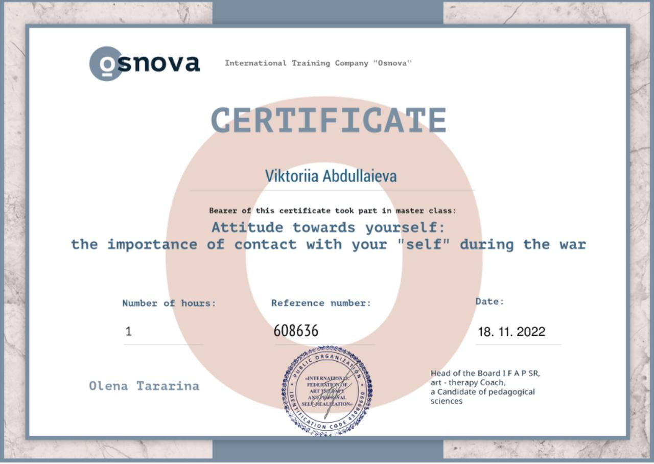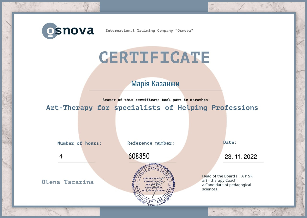Дякуємо тренінговій компаній «Основа» та її засновниці Олені Тараріній за змогу опанувати методи та техніки арт-терапії, які володіють значним діагностичним, розвиваючим, терапевтичним, трансформаційним потенціалом та є дієвим інструментом в професійній діяльності психолога.