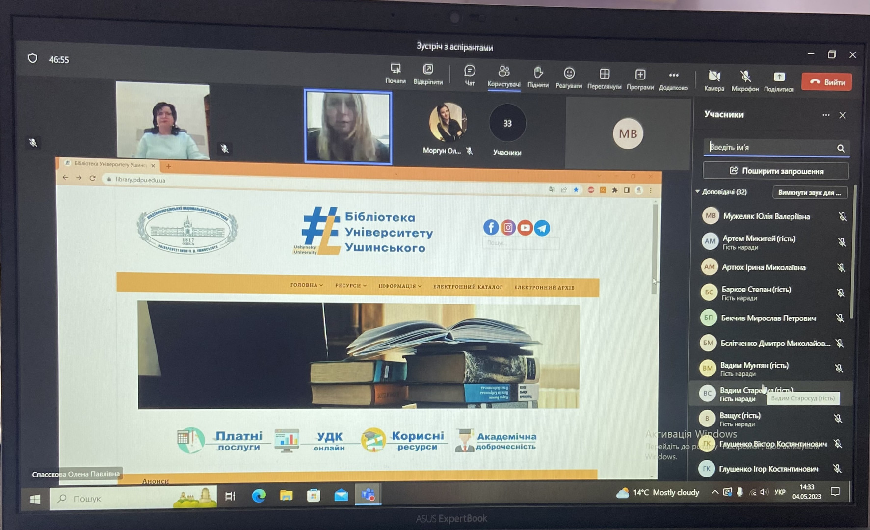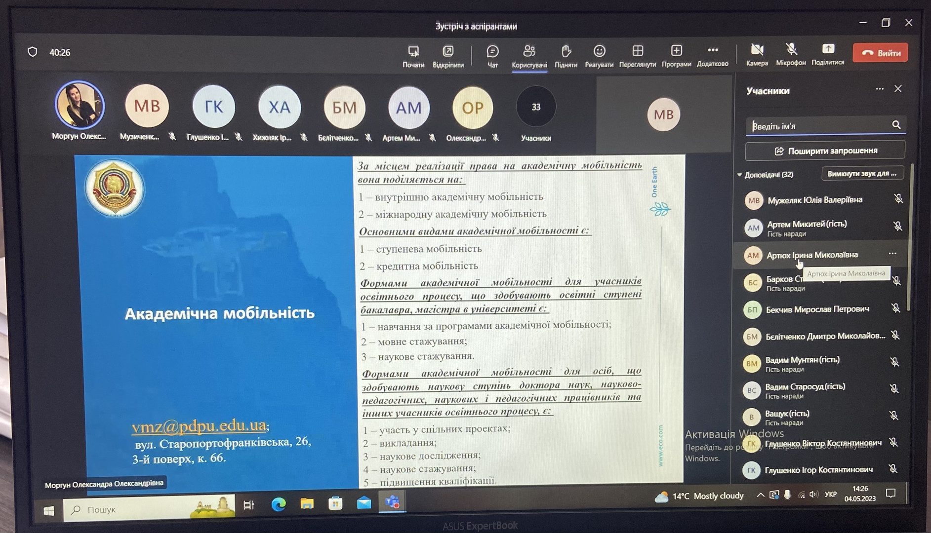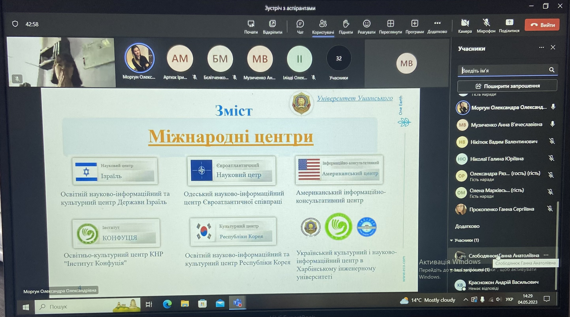 04.05.2023 року відбулася онлайн зустріч аспірантів першого року навчання, які вступили весною з керівництвом та основними відділами університету.