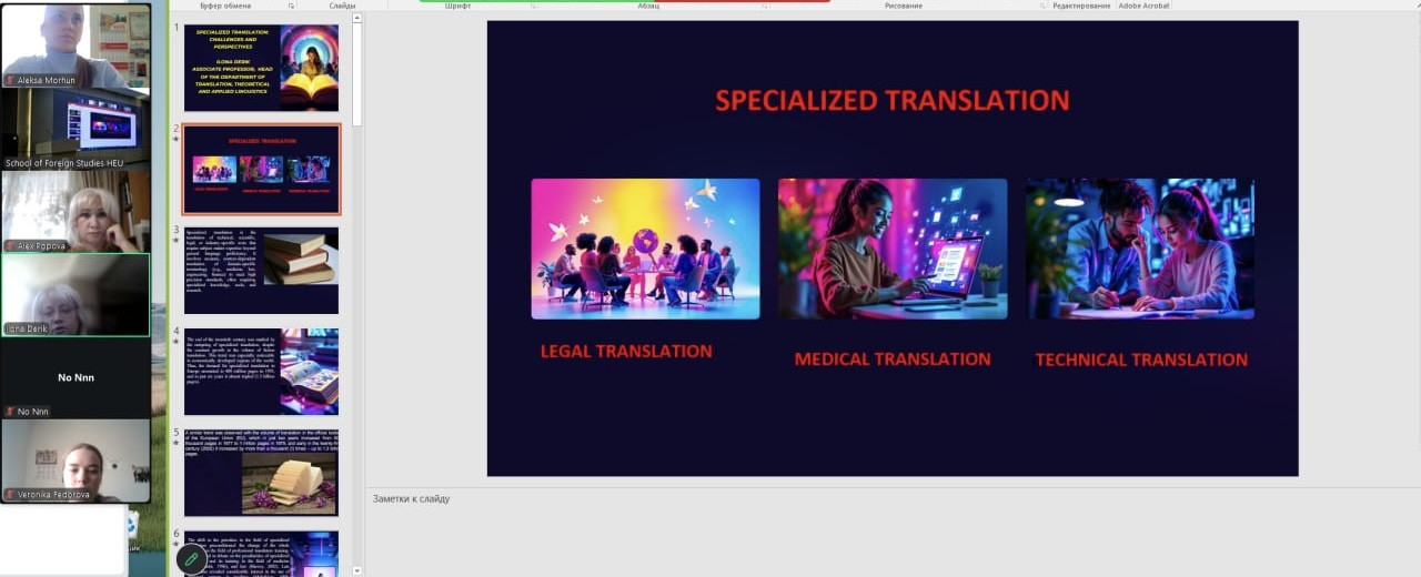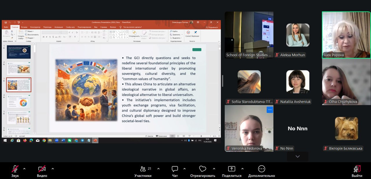 Проректор з наукової роботи, доктор політичних наук, професор Музиченко Ганна В’ячеславівна поділилася досвідом з політичних питань глобального розуміння ініціатив КНР (“The Global Civilization Initiative (GCI) in the System of Global Governance: Essence and Western Attitude”). Декан факультету іноземних мов, доктор педагогічних наук, професор Попова Олександра Володимирівна повідомила про лінгвокультірні аспекти розуміння фундаменту для розвитку глобальної цивілізації (“Linguacultural Foundation in the Spectrum of Global Civilization Development”). Завідувачка кафедри перекладу, теоретичної та прикладної лінгвістики Університету Ушинського» Дерік Ілона Морисівна порушила проблеми і визначила перспективи спеціалізованого перекладу (“Specialized Translation: Challenges and Perspectives”). Завідувачка кафедри германських і східних мов та методики їх навчання Юмрукуз Анастасія Анатоліївна представила результати дослідження концептосфери «ДІМ» в англійській та турецькій мовах (“Linguistic Means of Implementing the Concept HOME in the English and Turkish Language Pictures of the World”).