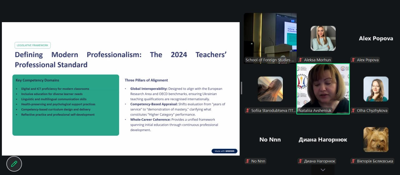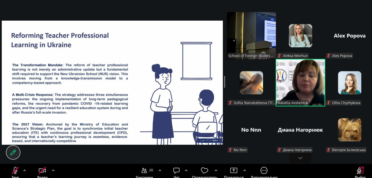 Наталія Миколаївна Авшенюк, доктор педагогічних наук, завідувач відділу зарубіжних систем педагогічної освіти та освіти дорослих Інституту педагогічної освіти і освіти дорослих імені Івана Зязюна НАПН України презентувала компаративний аналіз європейських тенденцій переосмислення професійної підготовки вчителів в Україні (“European trends for rethinking of teacher professional learning in Ukraine”).
