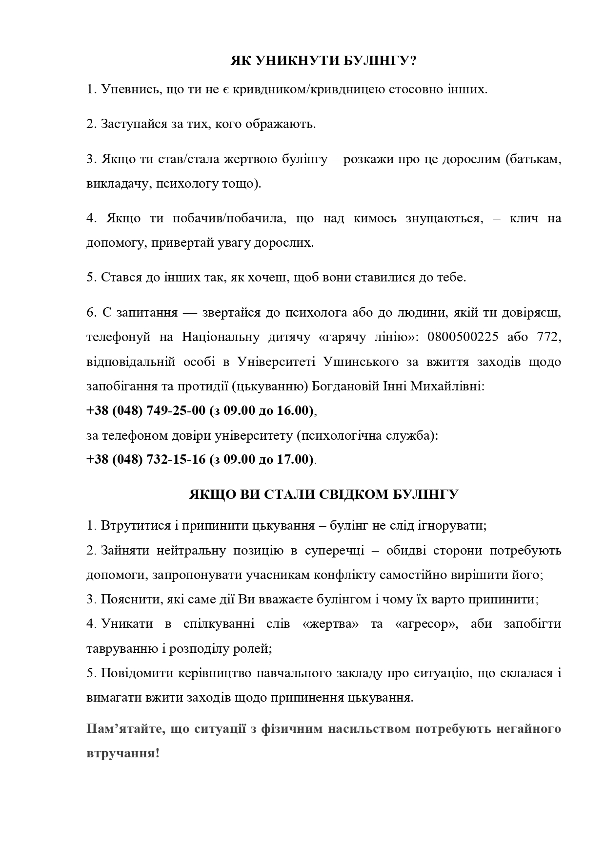 - Телефон довіри університету (психологічна служба): +38 (048) 753-08-66 (з 09.00 до 17.00).