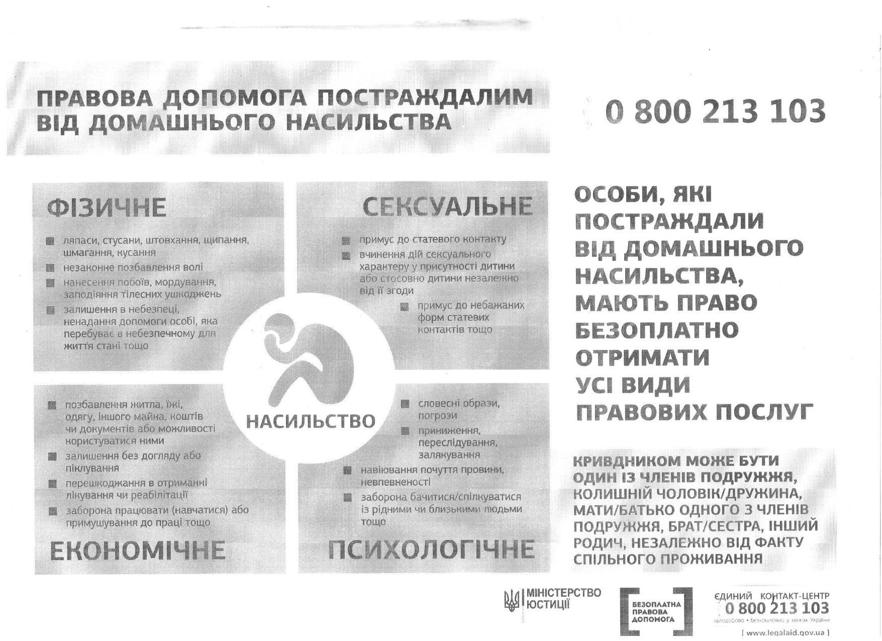 - Центр надання безоплатної правової допомоги 0 800 213 103;
