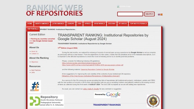 Оприлюднено чергове видання міжнародного рейтингу репозитаріїв «Transparent Ranking : Institutional Repositories By Google Scholar» від Webometrics, що містить близько 4 000 цифрових відкритих університетських архівів світу, зокрема й українські.