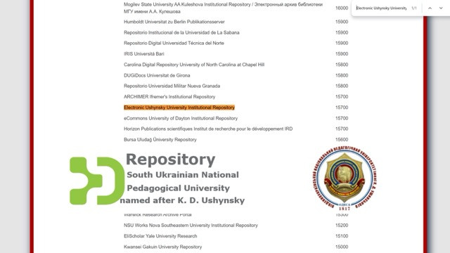 У 2024 році Репозитарій Університету Ушинського (Electronic Ushynsky University Institutional Repository) з показником 15 700 документів (на момент створення рейтингу), посідає 390 позицію з 3 994 університетських репозитаріїв світу.