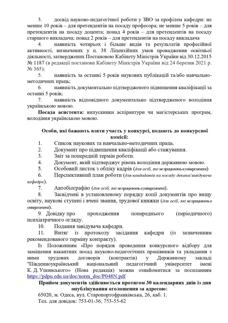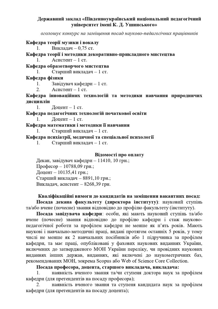 оголошує конкурс на заміщення посад науково-педагогічних працівників