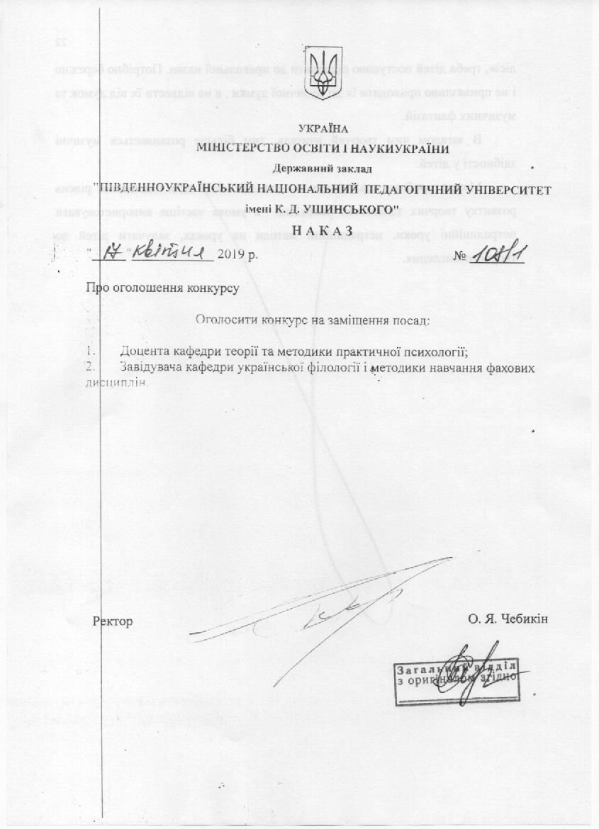 Конкурс на заміщення вакантних посад. Наказ №109 від 17 квітня 2019 року.