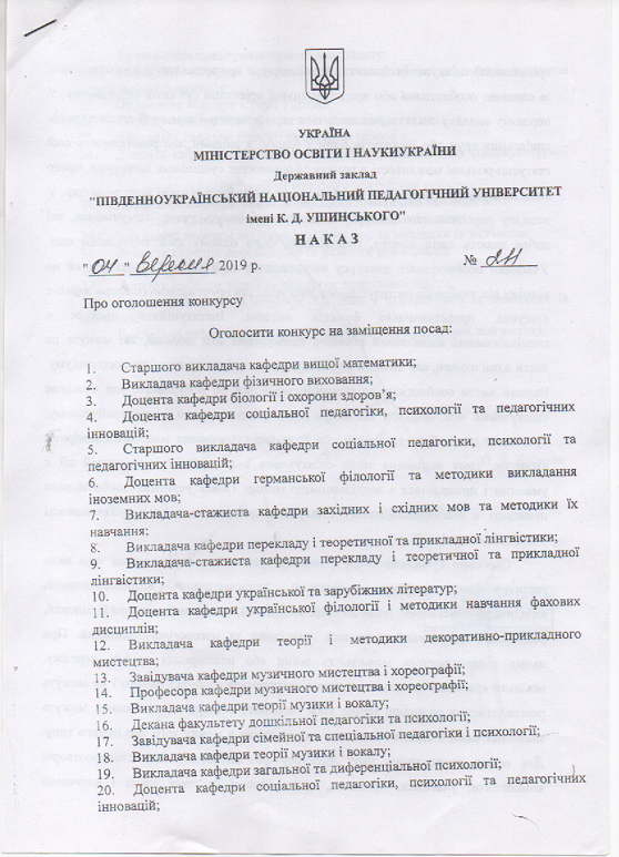 Конкурс на заміщення вакантних посад. Наказ №211 від 04 вересня 2019 року