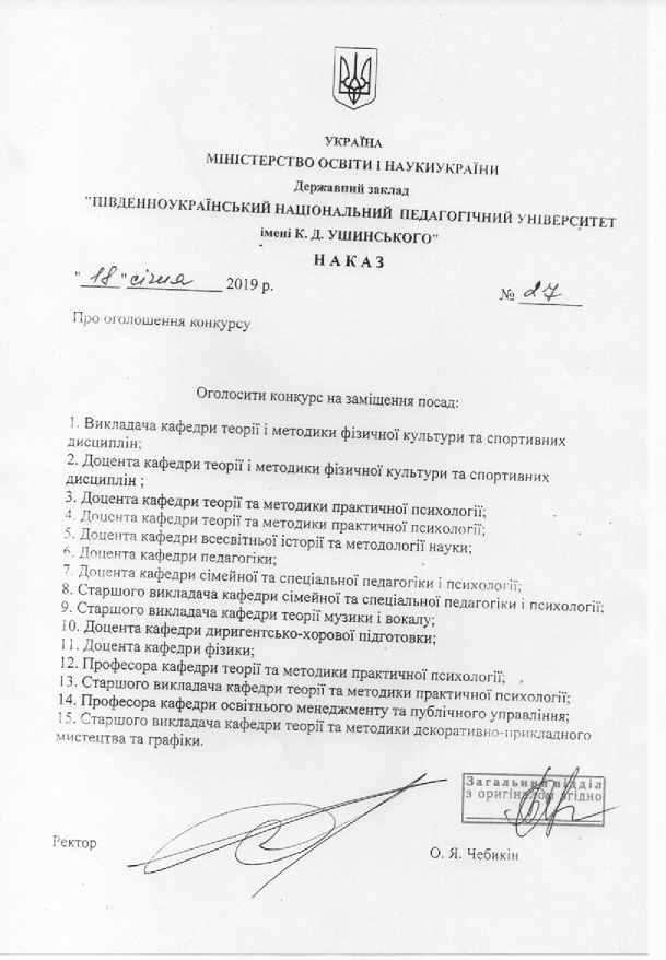 Конкурс на заміщення вакантних посад. Наказ №27 від 18 січня 2019 року.