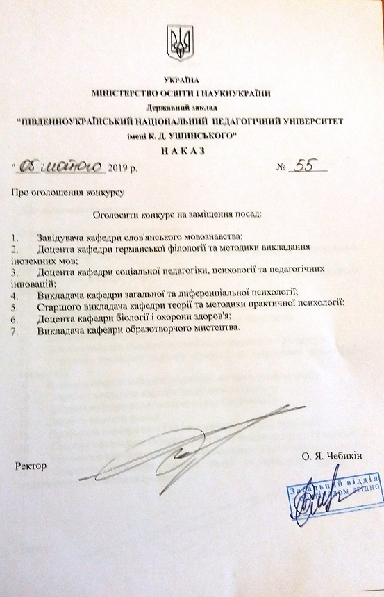 Конкурс на заміщення вакантних посад. Наказ №55 від 05 лютого 2019 року.