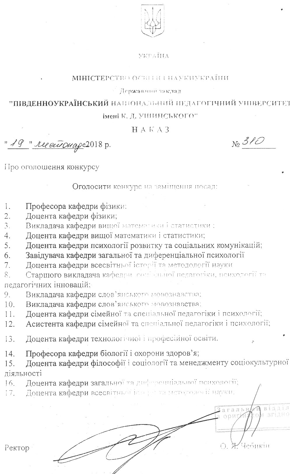 Конкурс на заміщення вакантних посад. Наказ №310 від 23 листопада 2018 року.