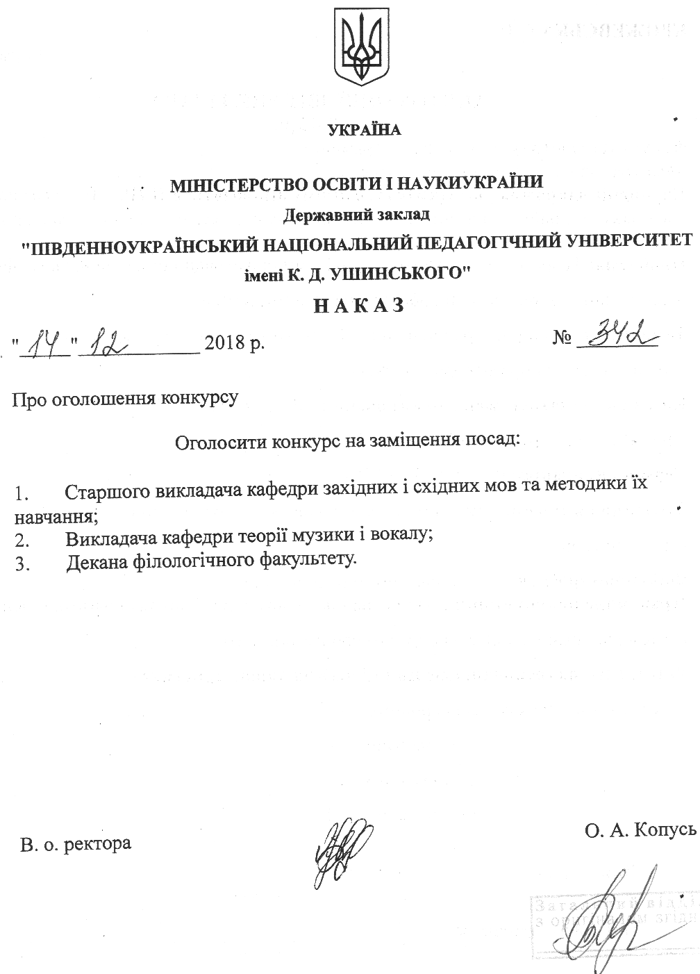 Конкурс на заміщення вакантних посад. Наказ №342 від 14 грудня 2018 року.