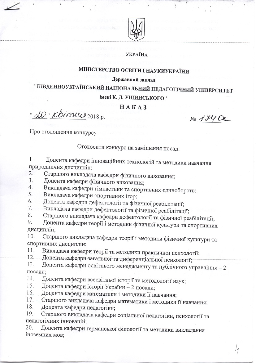 Конкурс на заміщення вакантних посад. Наказ №174-ОС від 20 квітня 2018 року.