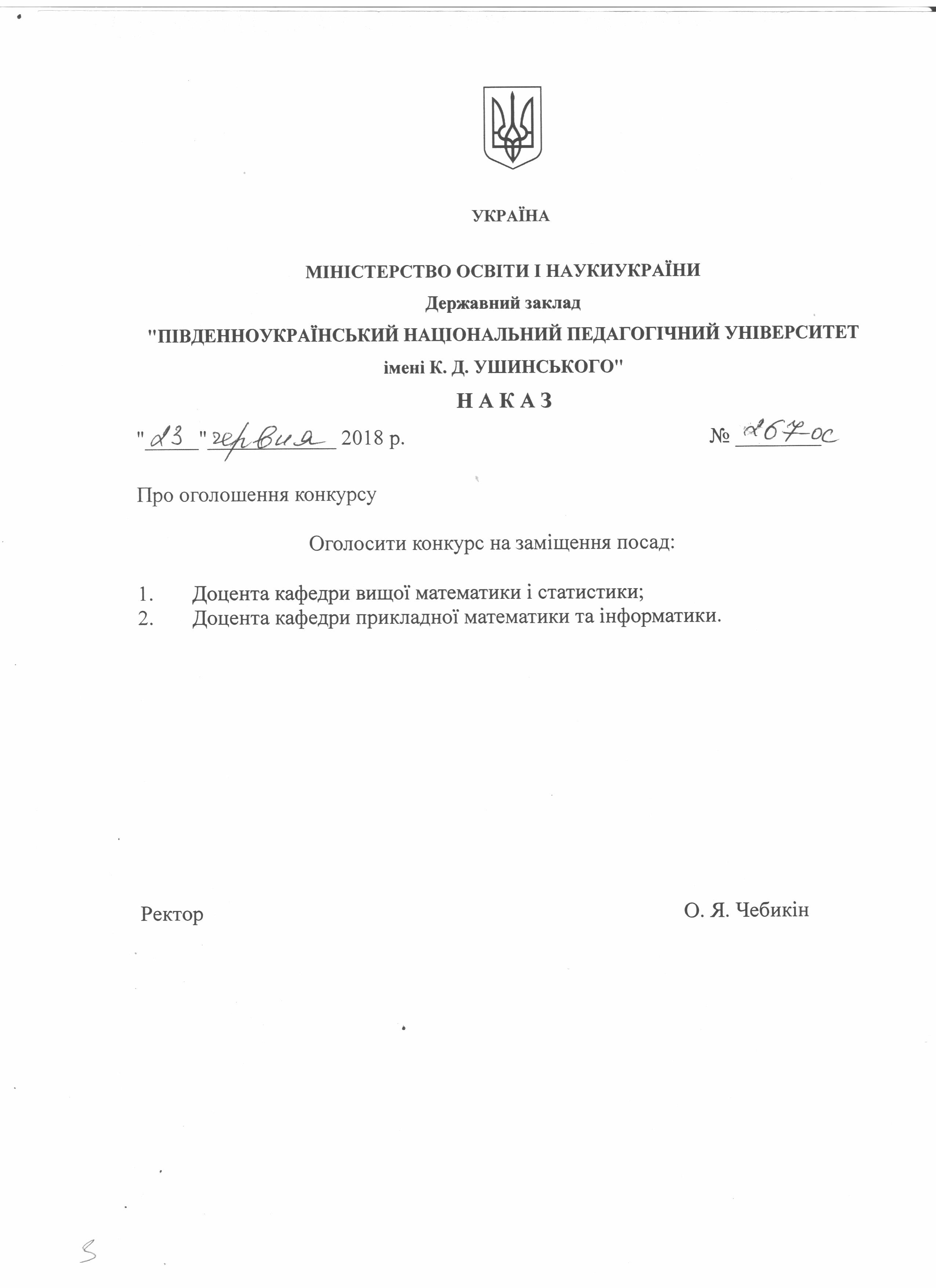 Конкурс на заміщення вакантних посад. Наказ №267-ОС від 23 червня 2018 року.