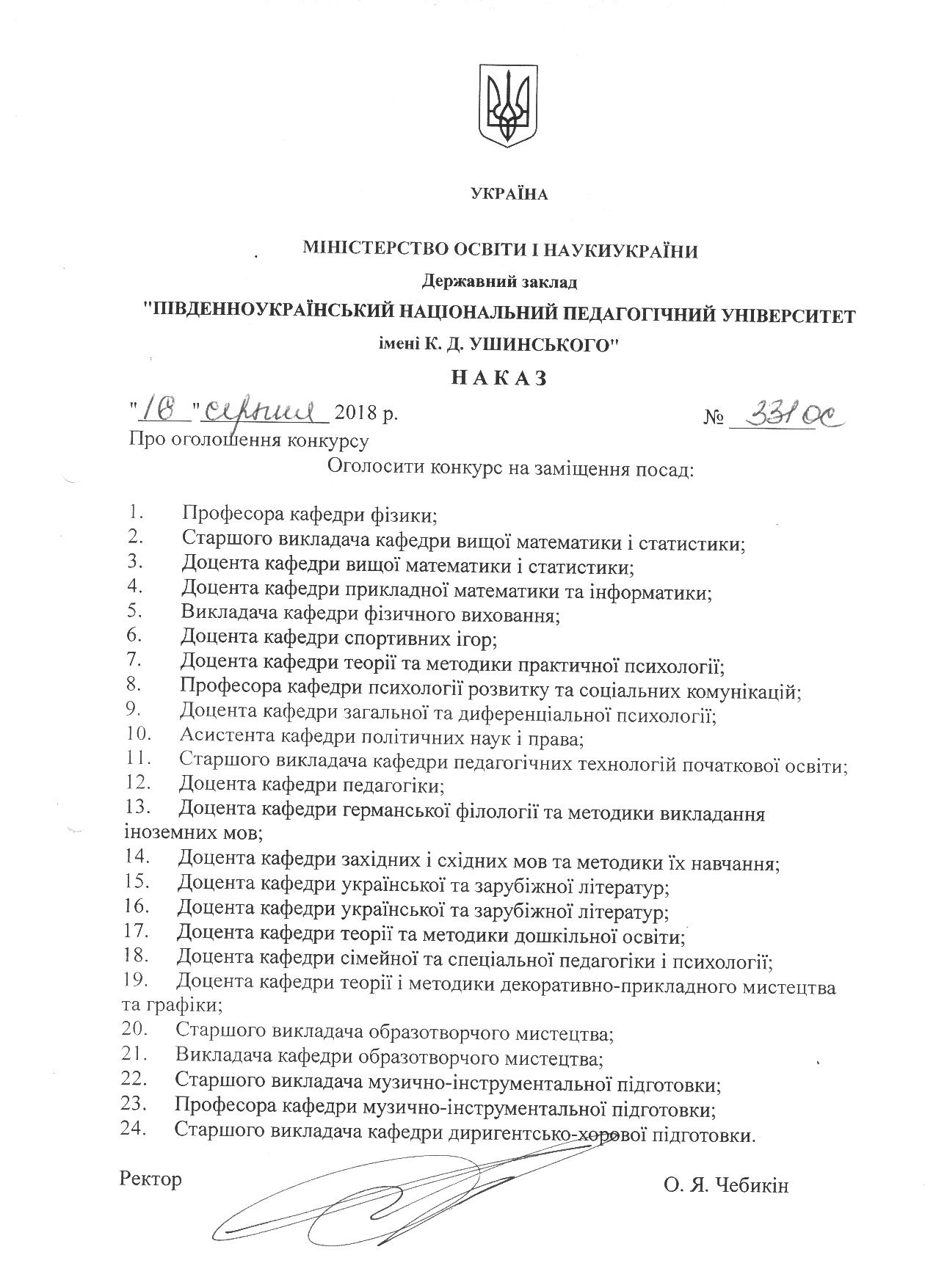 Конкурс на заміщення вакантних посад. Наказ №331-ОС від 16 серпня 2018 року.
