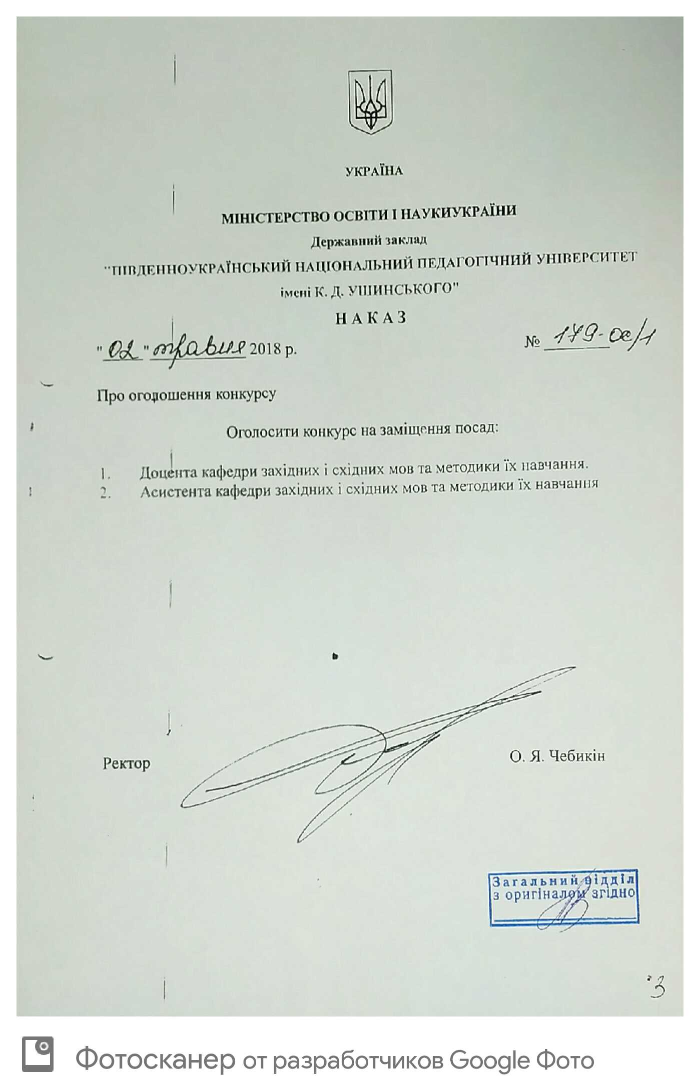 Конкурс на заміщення вакантних посад. Наказ №179-ОС/1 від 2 травня 2018 року.