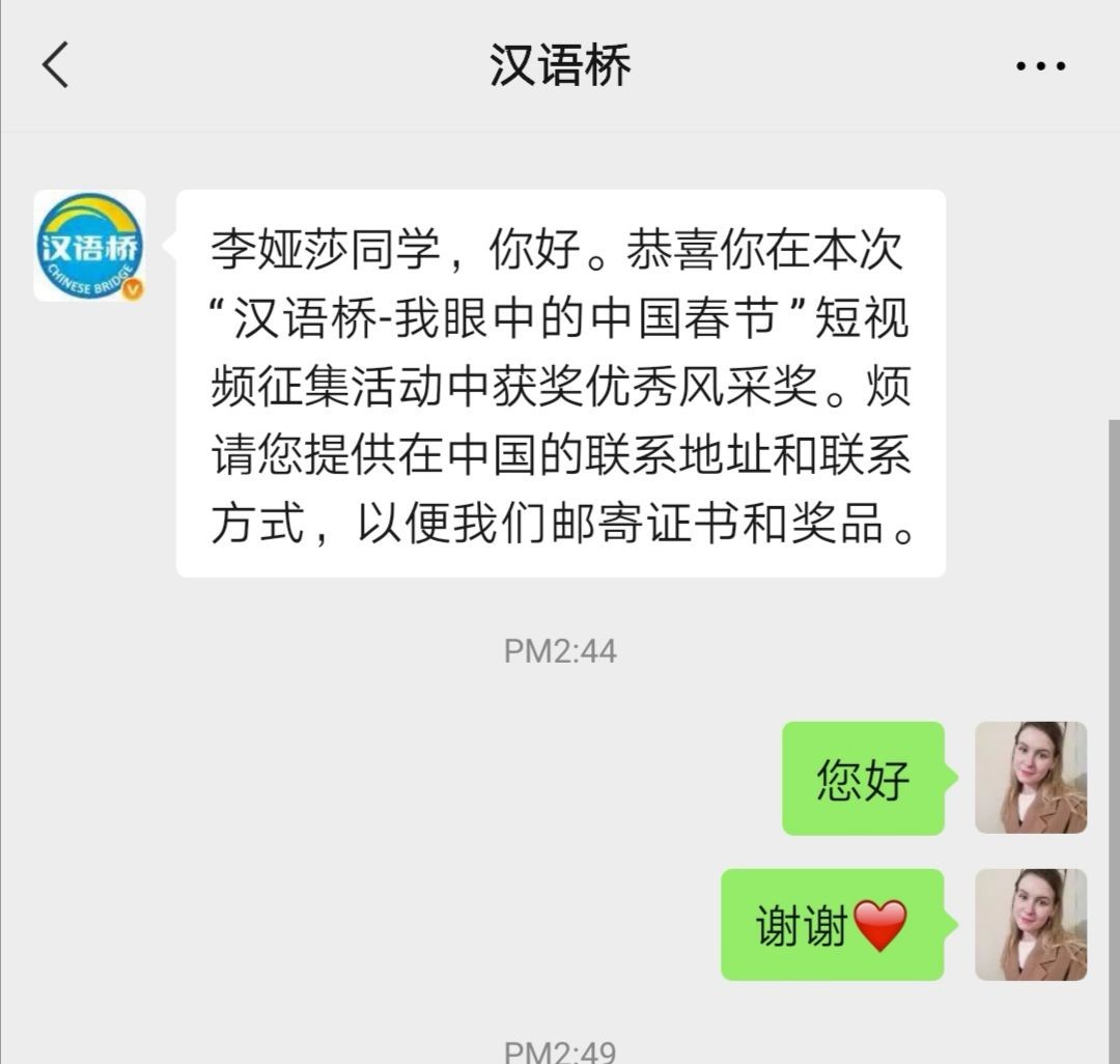 2021年3月10日“汉语桥-我眼中的中国春节”短视频征集活动圆满落幕,我院学生李娅莎(Закопайло Дарья)荣获优秀风采奖。