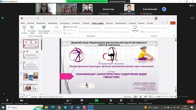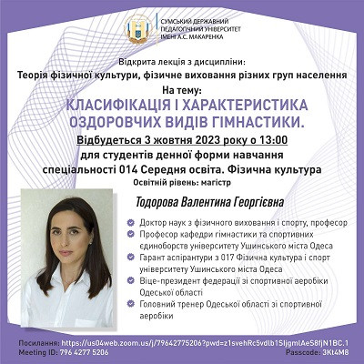 On October 3, 2023, Valentina Todorova, Doctor of Sciences in Physical Education and Sports, Professor, Professor of the Department of Gymnastics, held an open guest lecture on the discipline "Physical Culture Theory, Physical Education of Different Population Groups" on the topic "Classification and Characterization of Recreational Gymnastics" for the students of the second ( Master's) level of higher education, specialty 014 Secondary Education (Physical Culture) of Sumy State Pedagogical University named after A.S. Makarenko