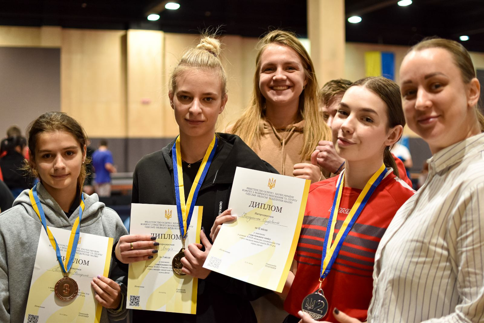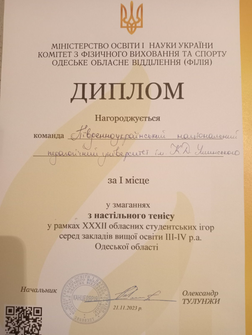 On November 21, 2023, the XXXII regional student table tennis games among higher education institutions of Odesa region took place, where the Ushynsky University team won 1st place in the overall standings. Among the young men, the 3rd year student of the 1st grade took the 3rd place. of the Institute of Physical Culture, Sports and Rehabilitation, candidate for master of sports of Ukraine in table tennis Petukhov Valeriy, and among girls, the graduate of the faculty of foreign languages, master of sports of Ukraine in table tennis Ivakhiv Valeriya took first place. The coach of the team Kucherenko H.V., senior teacher of the department of theory and methods of physical culture and sports disciplines.