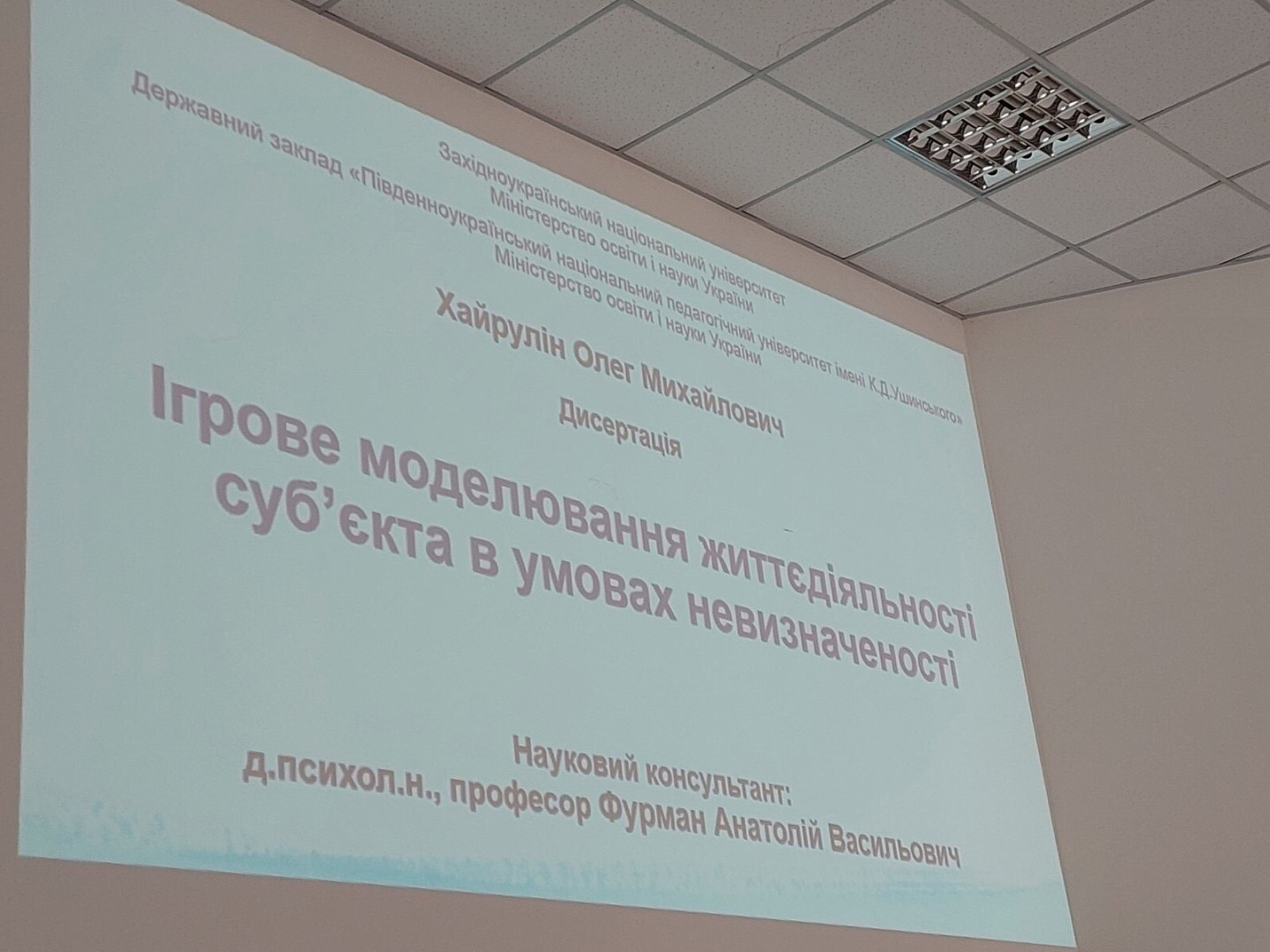 On November 22, 2025, the permanent specialized academic board D41.053.03 at the state institution "South Ukrainian National Pedagogical University named after K. D. Ushinsky" successfully defended the dissertation of Khairulin Oleh Mykhailovych on the topic: "Game modeling of the subject's vital activity under conditions of uncertainty" for the degree of Doctor of Psychological Sciences in specialty 19.00.01 - general psychology, history of psychology.