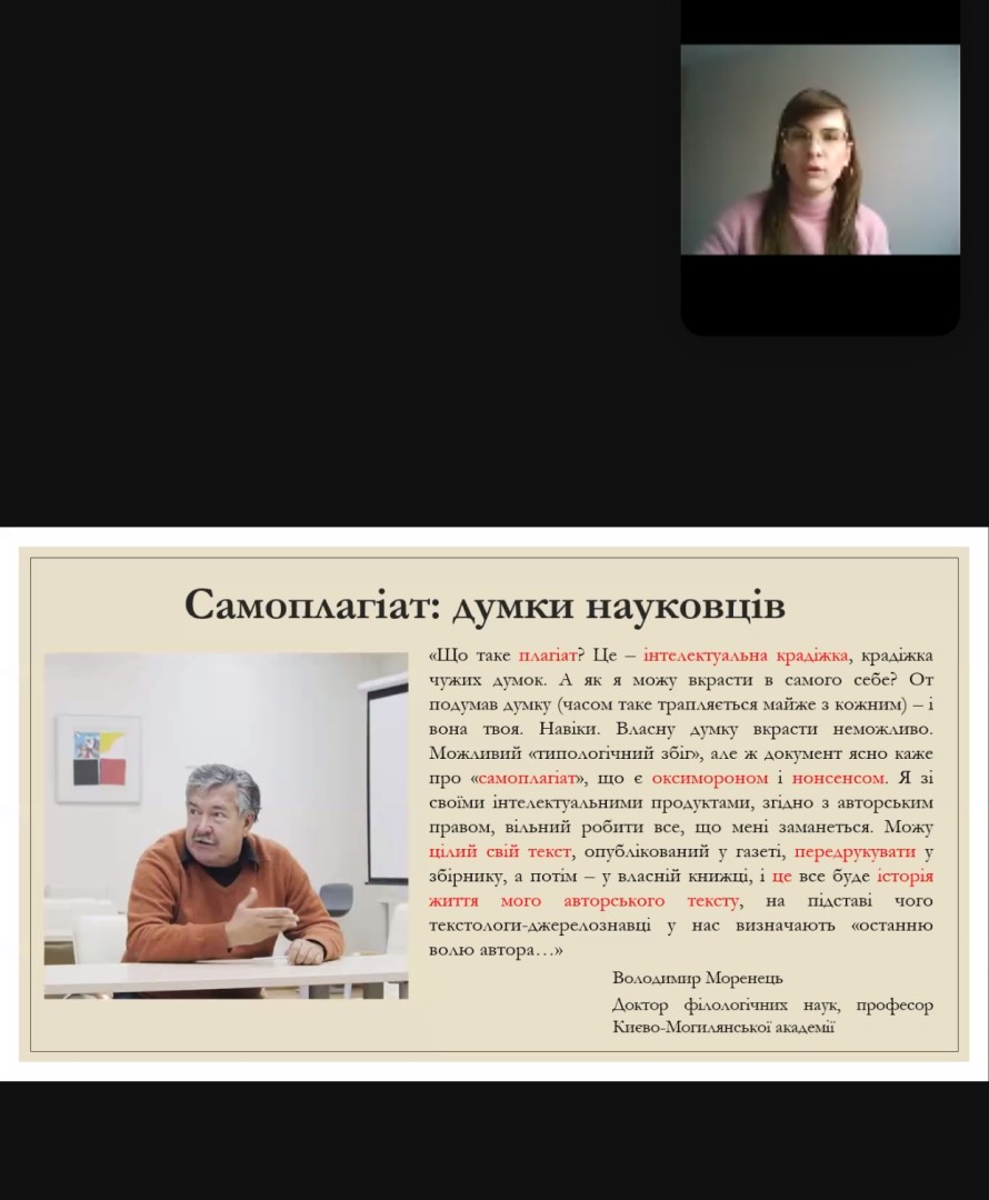 During the lecture, applicants had the opportunity to consider the main nature, causes and types of self-plagiarism, which were considered by examples; learned about the vision of the concept of self-plagiarism by Ukrainian philologists, about the possible result of non-compliance with academic integrity when working with scientific publications and how to protect yourself from the risk of being accused of self-plagiarism.