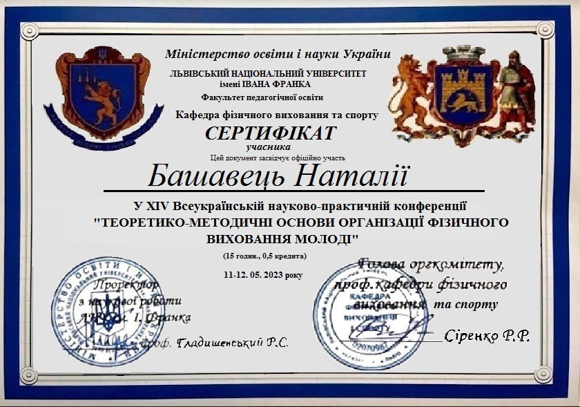 Student of the second (master's) level of education, specialty 014 Secondary education (Physical culture) Nastachenko Daria took part in the XIV All-Ukrainian scientific and practical online conference "Theoretical and methodological foundations of the organization of physical education of youth", which was held on May 11, 2023 by the department of physical education and Sports of Lviv Ivan Franko National University, which once again gathered scientists from the field of physical culture and sports to discuss the current issues of the development of this field.