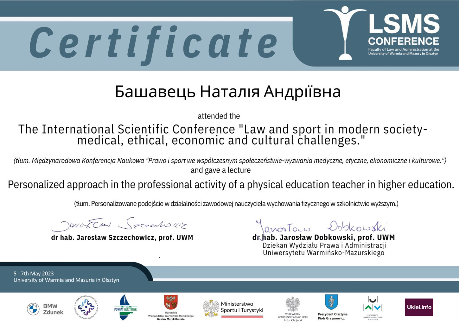 Student of the second (master's) level of education in specialty 014 Secondary education (Physical culture) Kasyanenko Maria took part in the International scientific conference "Law and sport in modern society - medical, ethical, economic and cultural challenges", which was held on May 5-7 in Olsztyn (Poland) at the Faculty of Law and Administration, The University of Warmia and Mazur.