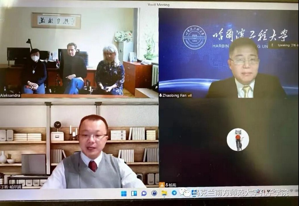 联欢会前,哈尔滨工程大学国际处樊赵兵处长、丁昕副处长以线上见面会的形式,将新春祝福送达孔院。乌克兰南方师范大学安德烈•瓦西里耶维奇校长代表南师大送去新春祝愿,并表达了扩大合作范围的意愿,表示疫情当下,南师大将尽一切努力帮助在乌工作的中方人员开展教学和文化活动。南师大孔院乌方院长波波娃女士对中方23名秋季学期到岗的老师表示感谢,希望新的一年孔院全体教职人员能携手并肩、共克时艰,乌方所有工作人员将竭尽所能积极为中方人员提供帮助。
