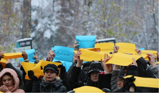 21 листопада в Україні відзначають День гідності та свободи – одне зі знакових офіційних свят, встановлене на честь двох революції, які відбулися в Україні у 2004 та 2013 роках. Цього дня українці вшановують пам’ять про людей, які під час Революції Гідності та Помаранчевої революції стали на захист демократичних цінностей, прав і свобод людини й громадянина, національних інтересів держави та її європейського вибору. Здобувачка третього (освітньо-наукового) рівня вищої освіти ОПП Філософія Елеонора Бутенко долучилась до урочистотей святкування у Вінниці Дня гідності та свободи. В першій половині дня відбулося покладання квітів до скульптурної композиції «Дерево Свободи» на майдані Героїв Небесної Сотні, а в другій – молодь влаштувала флешмоб на Європейській площі. У заході взяли участь родини загиблих на Майдані вінничан, керівники територіальних управлінь та відомств області, військовослужбовці ЗСУ, громадськість. Під час заходу всім перехожим роздавали синьо-жовті сердечка-магніти. В рамках флешмобу учасники намалювали контури карти України та вишикувались із синіми та жовтими папірцями на яких було вказано назви окупованих міст та міст, які постраждали від російської навали. На акцію прийшло понад три сотні людей.