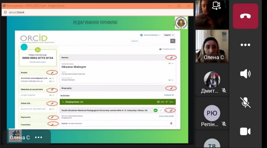 Викладачі кафедри педагогіки та аспіранти спеціальностей 011 Освітні, педагогічні науки і 015 Професійна освіта 21 вересня 2023 року брали участь в онлайн-лекції «ORCID: профіль науковця», яка була організована співробітниками бібліотеки Університету Ушинського. На лекції були розглянуті питання реєстрації, наповнення та ведення профілю. За допомогою мультимедійної презентації надано алгоритми простих і послідовних дій, які необхідно зробити користувачеві-науковцю, щоб досягнути бажаного результату. На зустрічі було розглянуто питання про особливості і переваги ORCID: спрощення та автоматизація процесу ідентифікації авторів і забезпечення можливості однозначного зв’язку з їх публікаціями; усунення проблеми різних варіантів транслітерації прізвищ дослідників, відмінностей в національних стандартах бібліографічних описів; надання унікального ідентифікатора і забезпечення можливості ведення персонального облікового запису для відображення дослідницької діяльності.