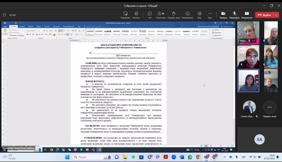 23 листопада 2023 року відбувся інформаційно-комунікаційний захід для здобувачів вищої освіти третього (освітньо-наукового) рівня, спрямований на підвищення рівня обізнаності аспірантів з питань формування та дотримання культури доброчесності в Університеті Ушинського.