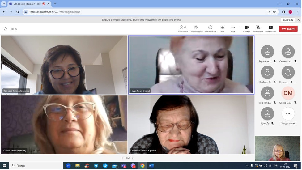 12 січня 2024 року відбулося відкрите громадське обговорення проєктів освітньо-наукових програм «Освітні, педагогічні науки» та «Професійна освіта». До засідання долучилися гаранти ОНП доктори педагогічних наук, професори Т. І. Койчева і Т. Ю. Осипова, здобувачі третього (освітньо-наукового) рівня вищої освіти спеціальностей 011 і 015, завідувач кафедри педагогіки, доктор педагогічних наук, професор І. А. Княжева, науково-педагогічні працівники кафедри, наукові керівники, стейкголдери ОНП «Освітні, педагогічні науки»: Кічук Надія Василівна, доктор педагогічних наук, професор, декан педагогічного факультету Ізмаїльського державного гуманітарного університету; Ковшар Олена Вікторівна, доктор педагогічних наук, професор, завідувач кафедри дошкільної освіти Криворізького державного педагогічного університету, та ОНП «Професійна освіта»: Ягоднікова Вікторія Вікторівна, доктор педагогічних наук, професор, проректор з науково-педагогічної та інноваційної діяльності Комунального закладу вищої освіти «Одеська академія неперервної освіти Одеської обласної ради»; Бєляк Ольга Миколаївна, кандидат педагогічних наук, доцент, директор Комунального закладу «Одеський педагогічний фаховий коледж», які надали слушні рекомендації щодо вдосконалення ОНП та висловили власне бачення перспектив розвитку програм. Зустріч була дуже насиченою та результативною.