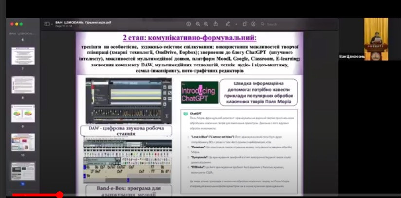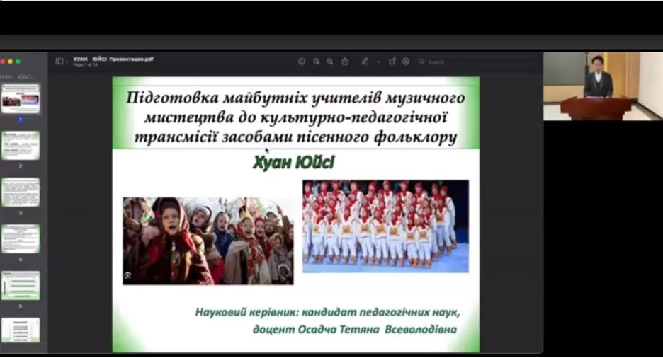 Хуан Юйсі (наукових керівник – кандидат педагогічних наук, доцент Т.В.Осадча). Тема дисертації: «Підготовка майбутніх учителів музичного мистецтва до культурно-педагогічної трансмісії засобами пісенного фольклору». Захист відбувся 26.01.2024 року о 12.00