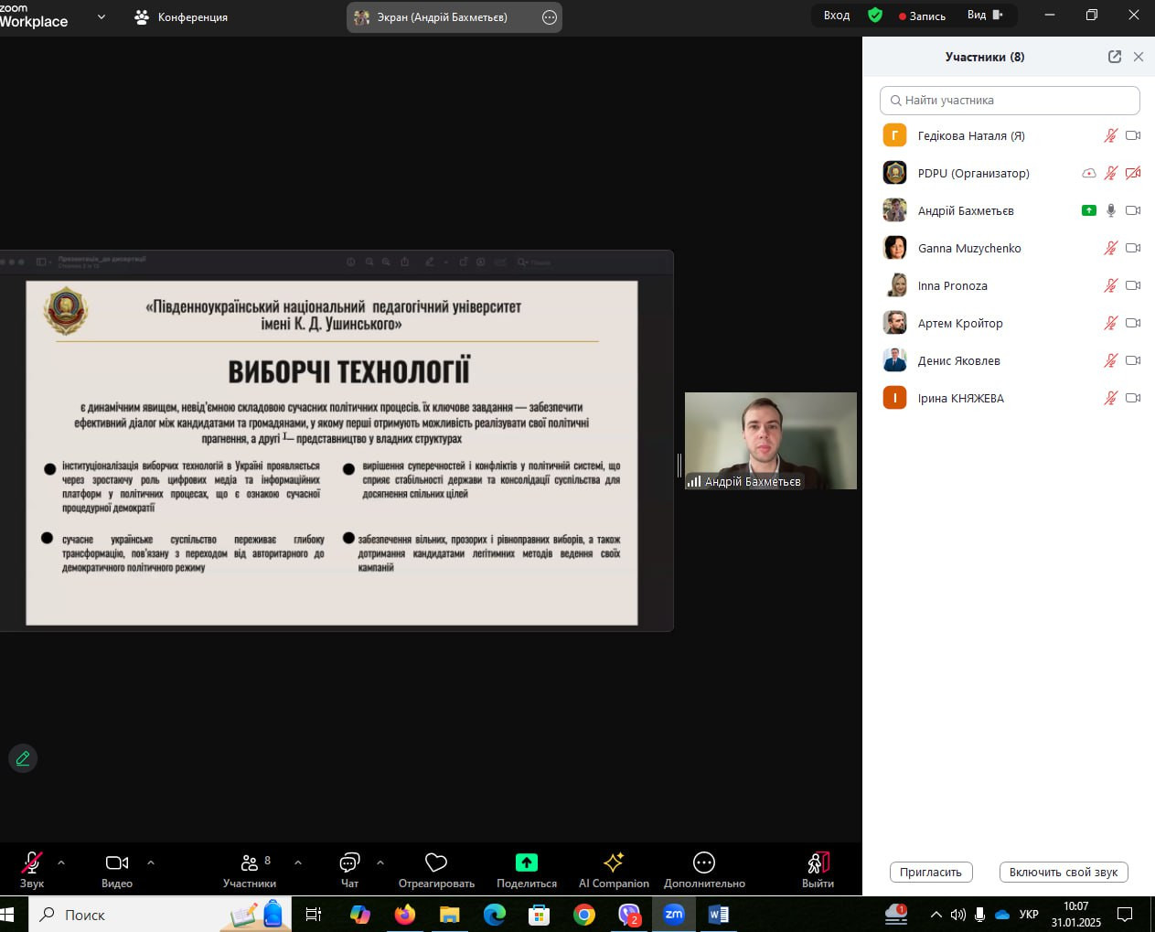 31 січня 2025 року в Університеті Ушинського на платформі Zoom відбувся успішний захист дисертації аспіранта кафедри політичних наук і права Андрія Бахметьєва на здобуття наукового ступеня доктора філософії зі спеціальності 052 Політологія з теми «Виборчі технології в Україні: специфіка застосування та тенденції розвитку». Науковий керівник – доктор політичних наук, доцент, доцент кафедри політичних наук і права Ростецька Світлана Іванівна.
