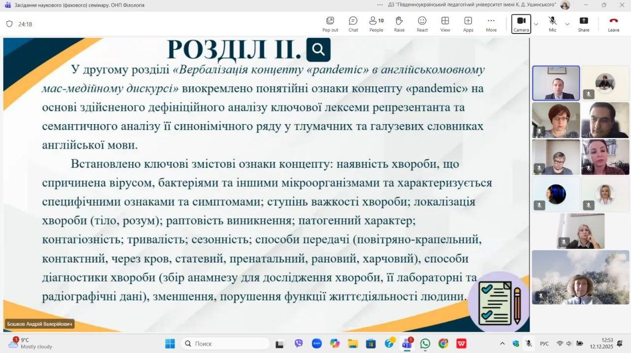 12.12.2025 року відбувся фаховий (науковий) семінар, під час якого аспірант третього року навчання за освітньо-науковою програмою «Філологія» Андрій Бошков представив результати свого дисертаційного дослідження за темою: «Англійськомовна вербалізація концепту «PANDEMIC» у науковому та MAC-медійному дискурсах». У доповіді було висвітлено основні теоретико-методологічні засади роботи, ключові положення наукової новизни, а також практичне значення отриманих результатів для сучасної філологічної науки.